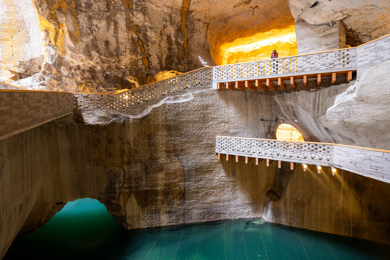 针对这一困境,项目团队秉持“最小干预”“建筑针灸”的修复理念,将地质加固、景观再造与文化活化深度融合。一方面精准开展危岩排查与加固工作,最大限度保留原始矿洞风貌;另一方面对原有生产通道进行改造升级,打造特色景观通廊,同步嵌入多元功能空间。在投资模式上,项目创新采用“财政引导、社会参与”机制,以财政资金撬动社会资本投入,引入特色业态,成功打造“石水共生”的文旅新场景。