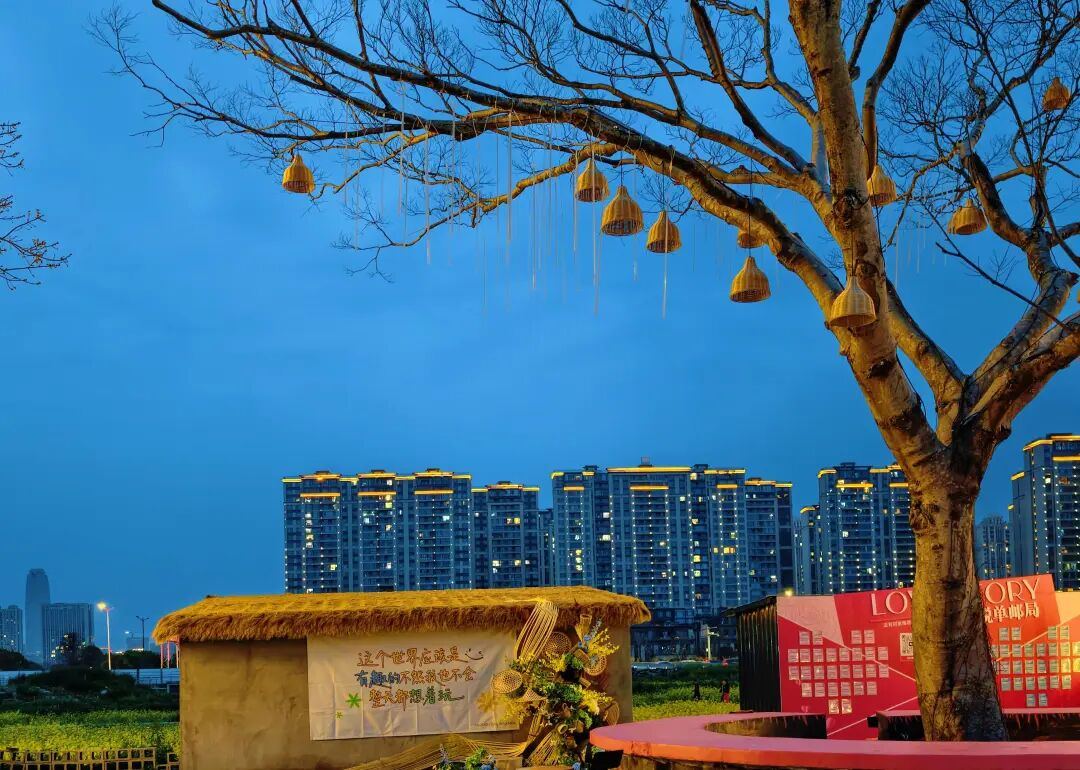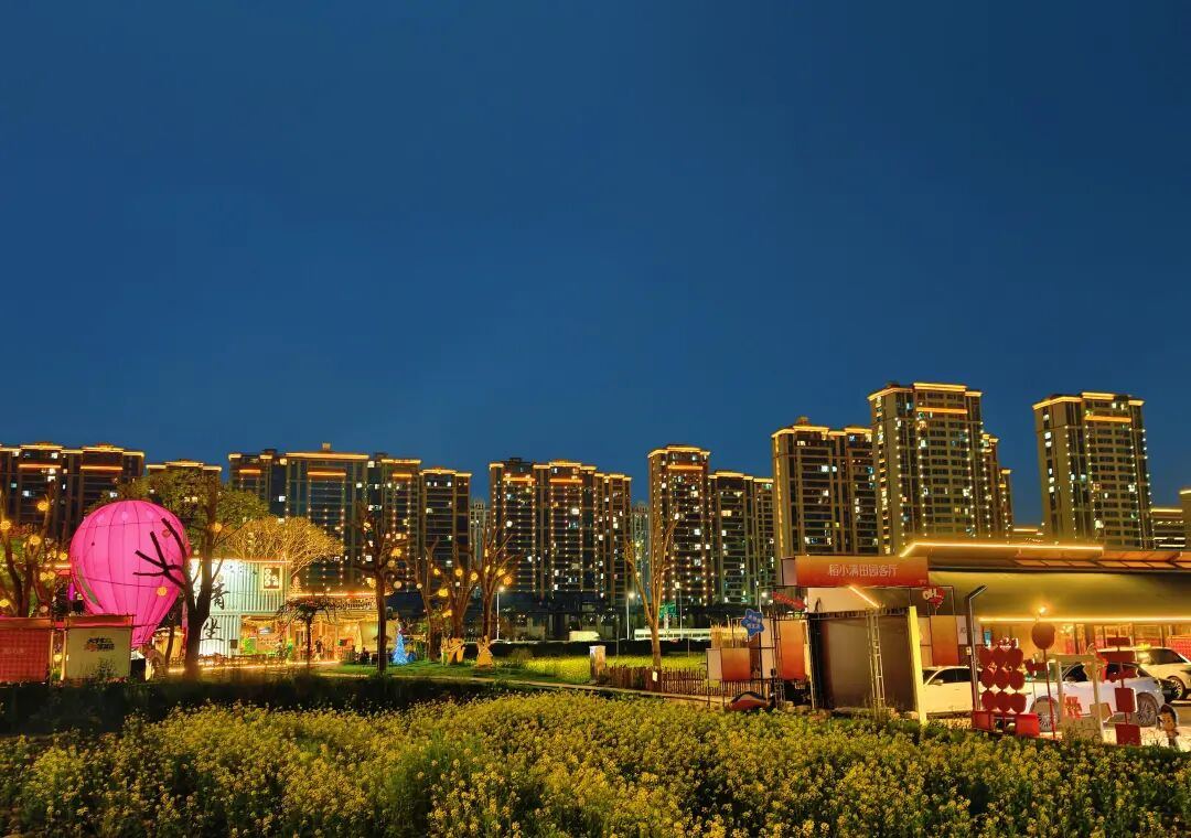 等到夜幕降临,灯光秀亮起,缤纷的彩灯缠绕在花田周边,把金黄的油菜花衬得愈发美丽。晚风拂过花浪,远处的高楼灯光与花海光影交织,既有城市的繁华氛围感,又有田园的静谧浪漫,仿佛闯入了现实版童话世界,随手一拍都是氛围感大片!