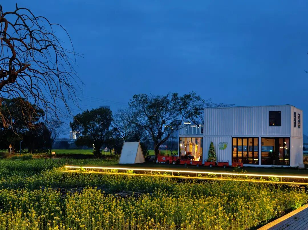 坐在小满大院,身后是金黄花海,抬头是城市霓虹,低头是咖啡与美食。偶尔有S1轻轨呼啸而过,与花海、灯光、咖啡座同框,随手一拍自带故事感,氛围感直接拉满!