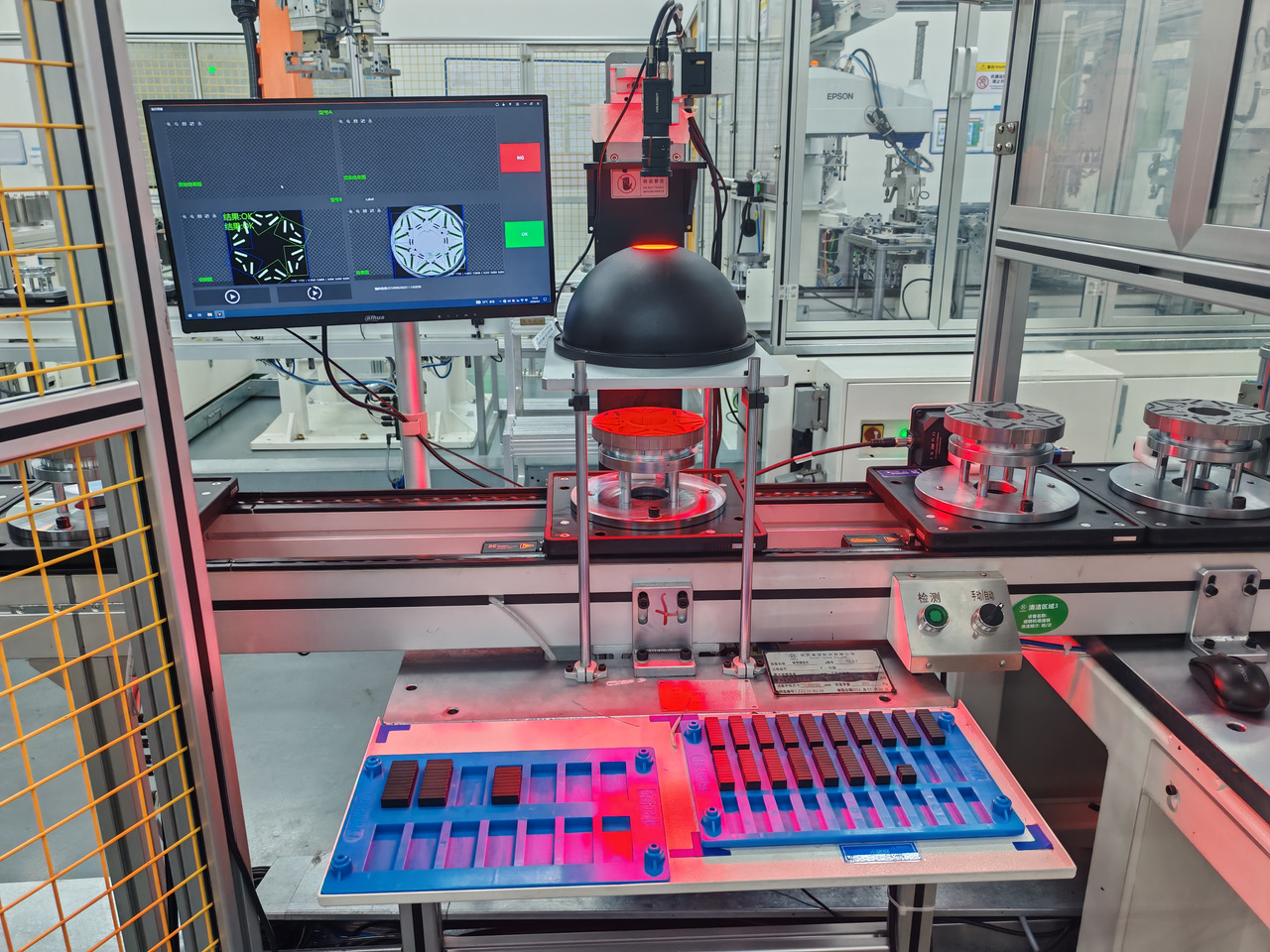 只见一个待检的电机转子被精准送到检测位,头顶半球光源“啪”地亮起来,像一双智能眼睛。几秒钟功夫,转子每一处细节都被拍得明明白白。左边大屏同步刷新数据,各项指标一目了然。