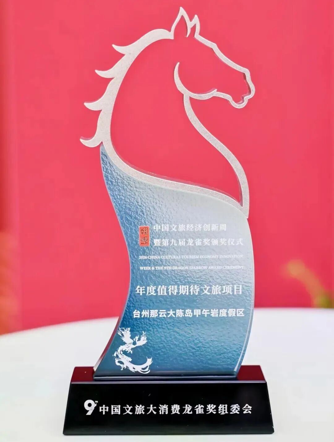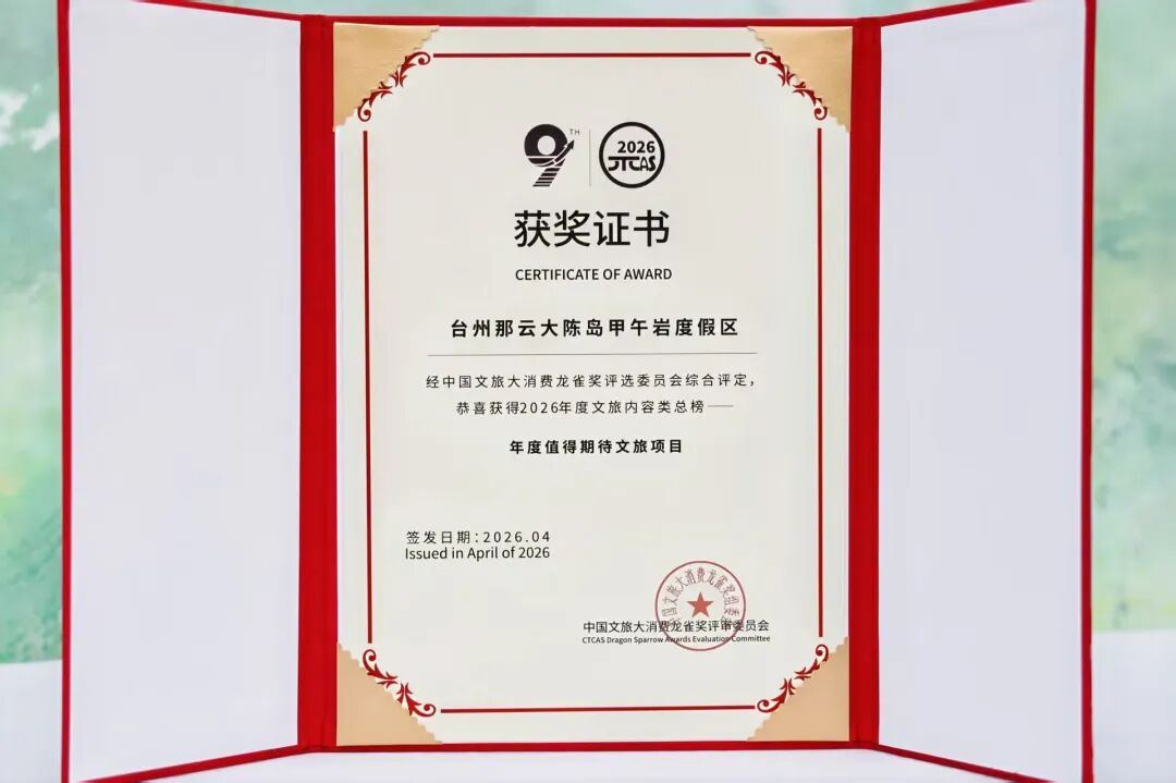 近日,2026中国文旅经济创新周暨第九届龙雀奖颁奖盛典在宁波举行。台州那云大陈岛甲午岩度假区项目,从全国超万家参评机构中脱颖而出,斩获2026年度文旅内容类总榜“年度值得期待文旅项目”大奖。合作方浙江那云文旅有限公司同步摘得年度“产业+”文旅创新集团称号,实现“项目+集团”双奖加冕,为椒江文旅高质量发展再添重磅荣誉。