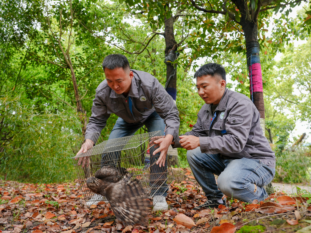 现场,红隼、猫头鹰率先振翅高飞,七彩山鸡、斑鸠等奔向山林,和平鸽齐飞盘旋。这些动物多为市民发现的受伤个体或被遗弃幼雏,经园区兽医、饲养员数月至一年多救治与野化训练,经评估已具备野外生存能力。
