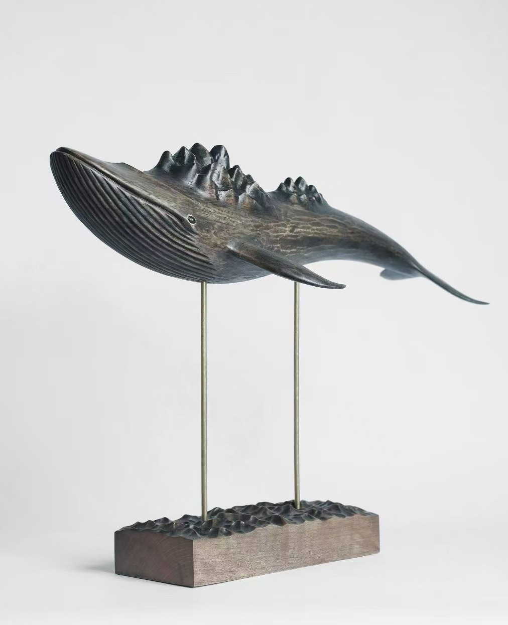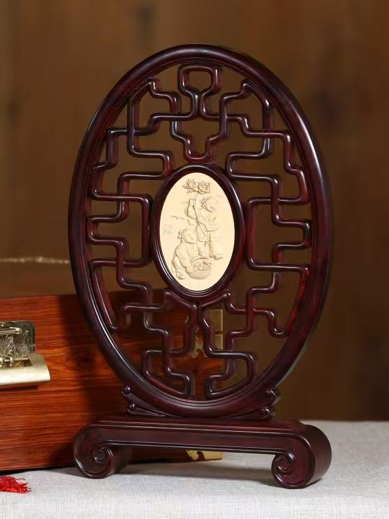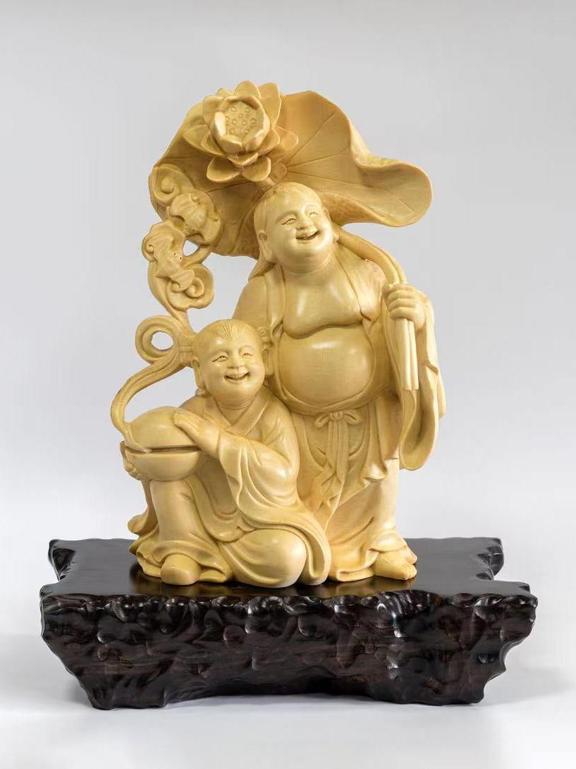 “和合二圣”黄杨木雕刀法细腻,寒山持荷、拾得捧盒,“荷”“盒”谐音“和合”,温润木色与圆满寓意相得益彰。天台山“一根藤”技艺打造的和合·桌屏同样吸睛,96根木条不用一钉一铆,以榫卯盘曲交织,线条回环不断,寓意子孙兴旺、和合美满。