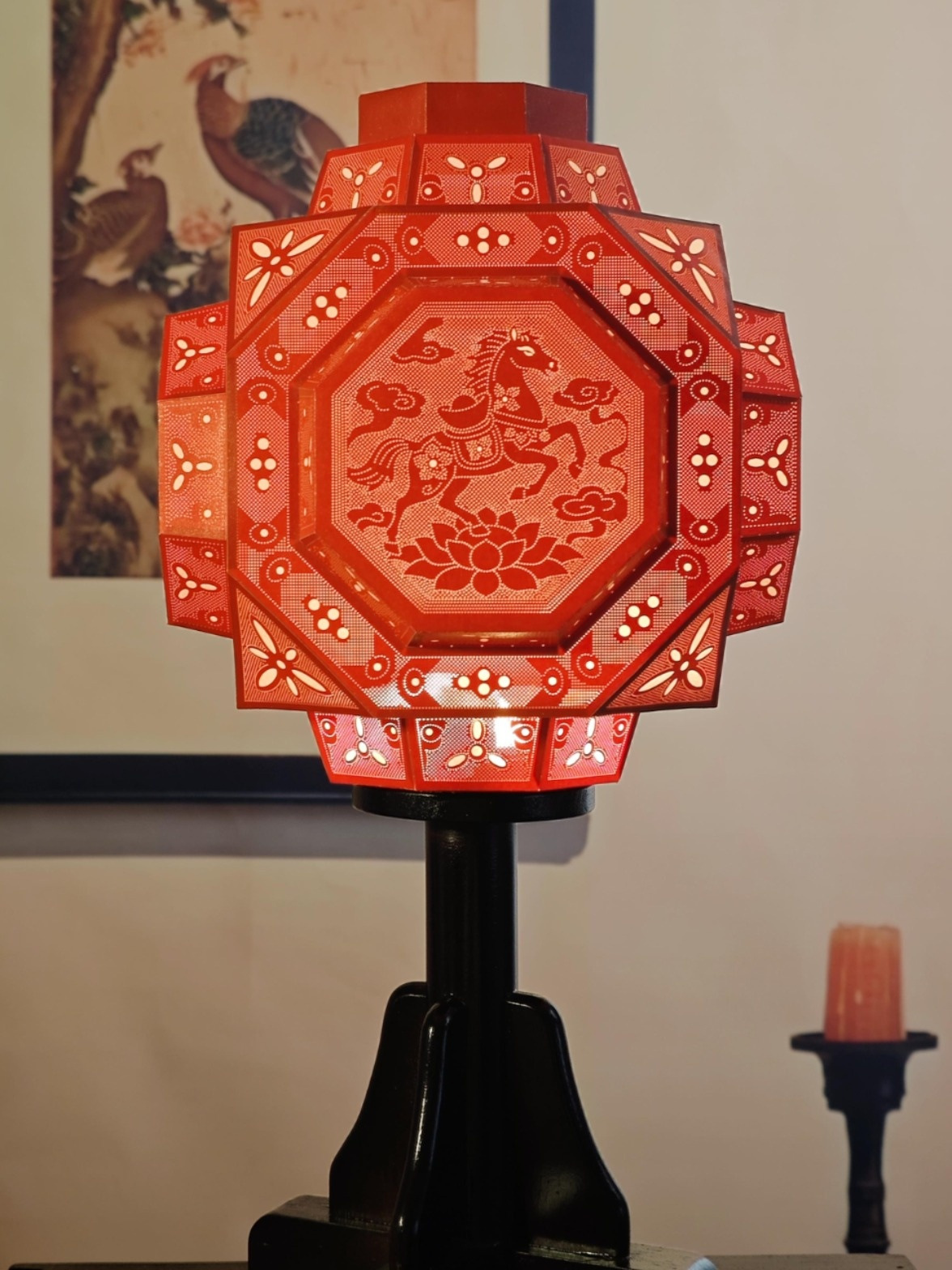 台州刺绣通过“抽、拉、雕”减法工艺在布上“做雕刻”,镂空玲珑、虚实相生,团扇、丝巾、手包等作品将东方韵味与国潮新意完美融合,每一缕丝线都传递着和合温度。仙居针刺无骨花灯作为国家级代表性非遗,素有“中华第一灯”的美誉,通身无骨架,仅凭千万针孔拼接成灯,光线穿透时朦胧剔透、如玉生辉。此次展出的“瑞马亨通桌面台灯”以朱红为底,“瑞马踏莲”纹样灵动雅致,既寄寓新春祥瑞,又彰显万物和谐的和合内核。