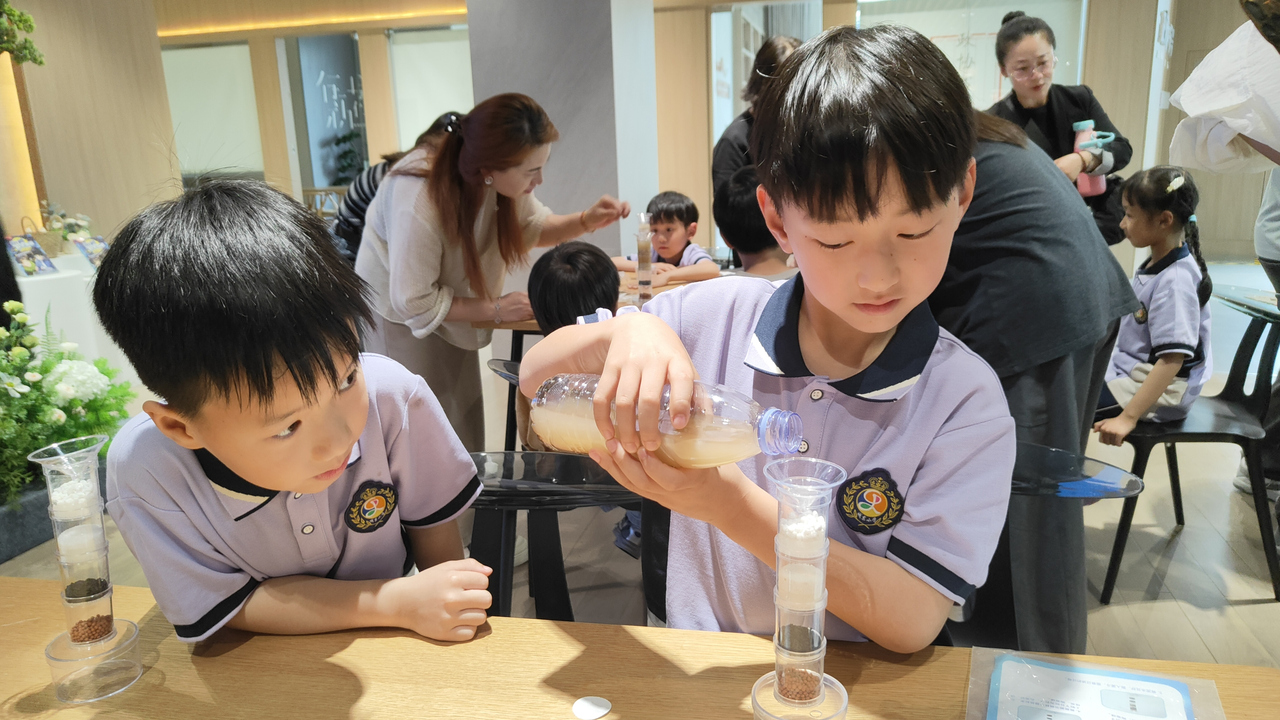 活动中,亲子、师生共读了《米吴科学漫画--奇妙万象篇·海湾科学奇旅》,在阅读中了解河水污染、居民集体生病的原因,及用化学、净水等方式破解危机的相关知识。在科学实验环节,工作人员为孩子们讲解污水净化原理和自来水厂净水流程,通过亲子协作共同制作简易净水器,让环保知识从书本走向实践。在轻松互动和问答中,现场成为一次温馨的“家校社协作”“幸福家长”亲子关系成长课堂。
