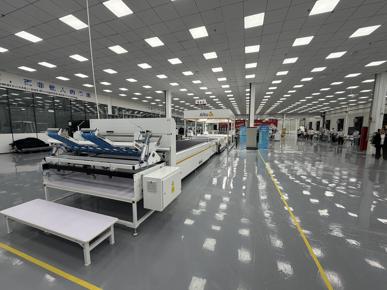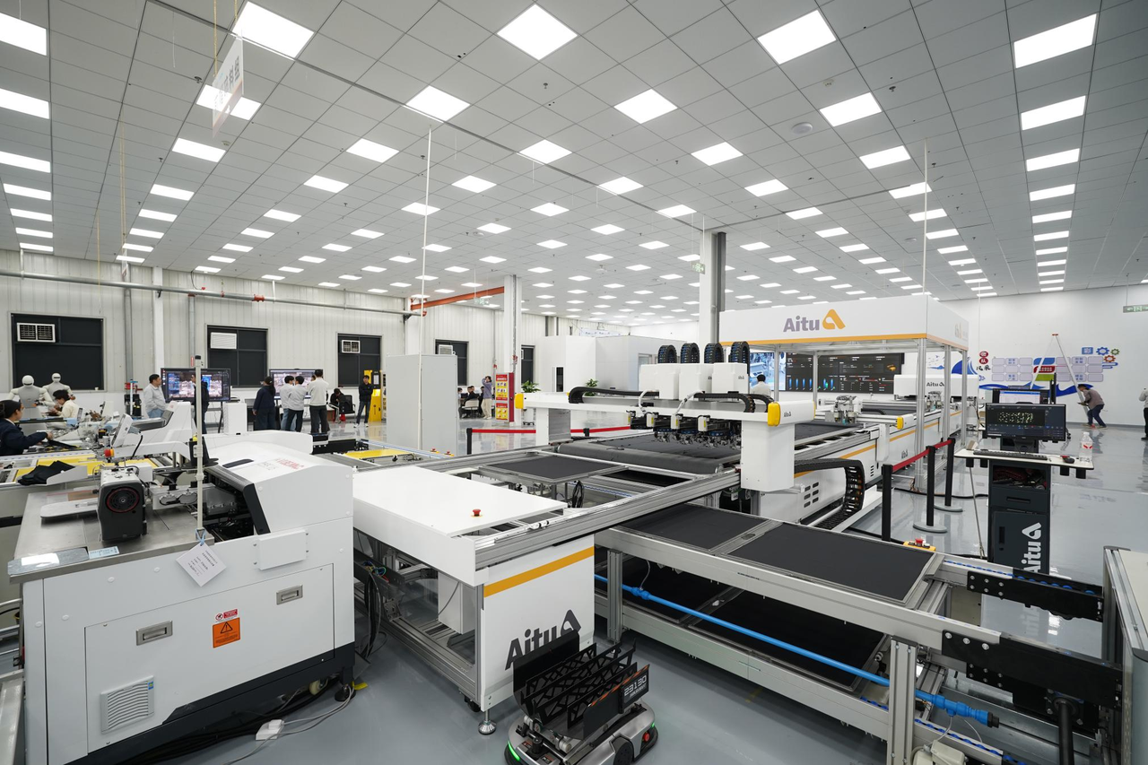 产线打通自动上料、智能验布、AI避裁排版、智能抓取、数字化缝制全流程,实现送料、裁剪、缝制联机一体化,消灭工序流转浪费,生产数据全程互通。