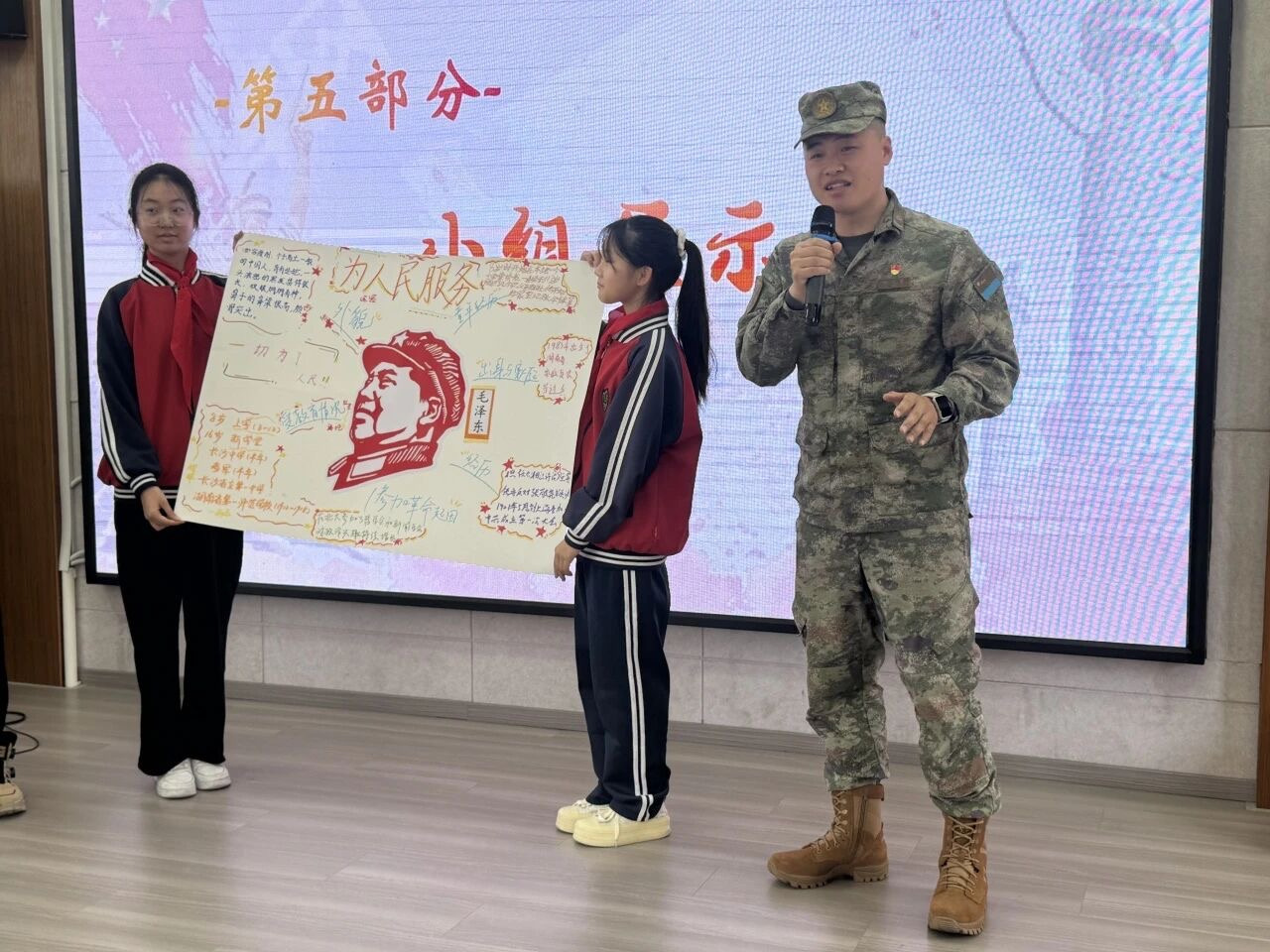 如果说一个人读书是思考,那么一群人读书就是智慧的碰撞。战士、老师、学生混编成4个小组,抽取《红星照耀中国》中的关键人物选题。大家伏案执笔,一张张巨大的画纸,变成了一幅幅红心地图。当各小组代表上台展示成果时,我们看到了深度阅读的化学反应——那是对红色基因最生动的传承。