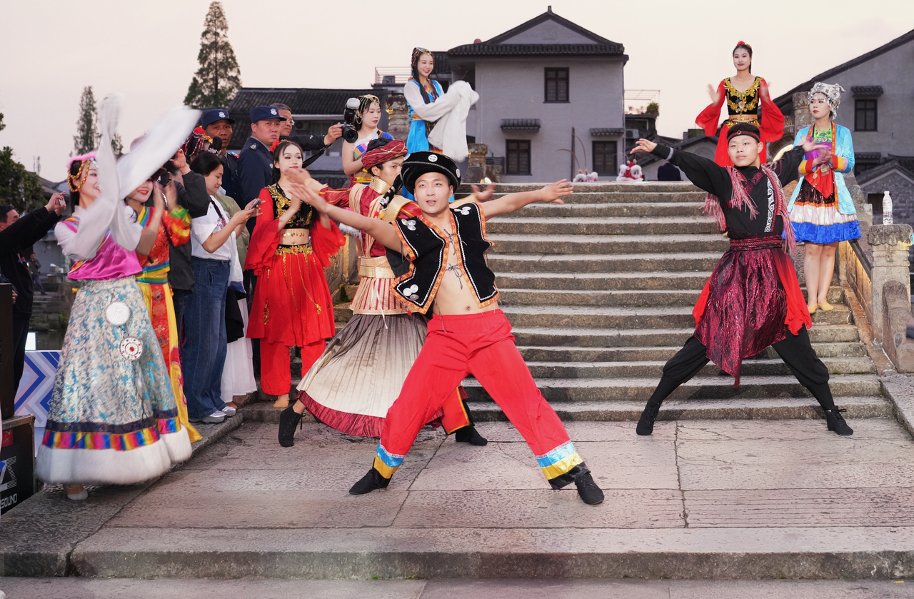 除主舞台的精彩演出外,五洞桥东侧的沉浸式互动体验区人气高涨。在“千年永宁唱响‘三月三’”主题区域,各族同胞带来了竹竿舞、民族舞串烧等展演。五色糯米饭、馕饼、酥油茶等特色美食飘香四溢,剪纸、翻簧竹雕、台州非遗膏方等传统技艺吸引众多市民驻足体验。