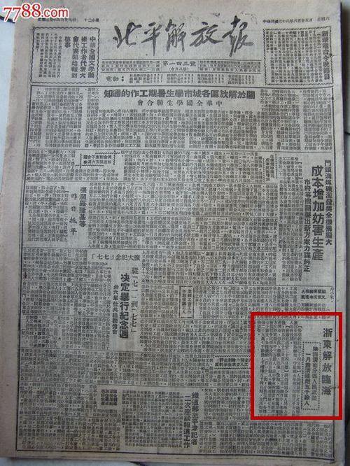 《北平解放报》、《群众日报》等多张报纸载;“浙东临海县城解放”。图片来源:7788.com网站