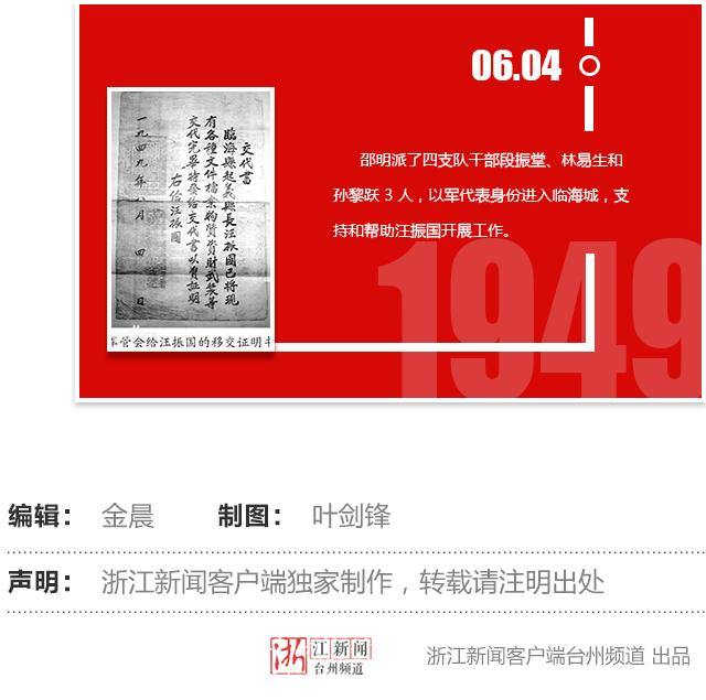 6月4日,邵明派了四支队干部段振堂、林易生和孙黎跃3人,以军代表身份进入临海城,支持和帮助汪振国开展工作。