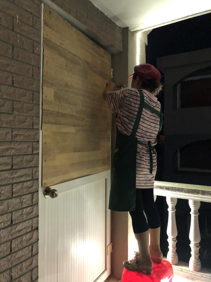 台风来临之际,大陈敬老院积极做好防台工作,工作人员正在为门窗进行钉木板加固。(记者 陆乐 通讯员 叶力帆)