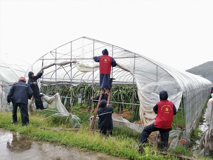 8月9日下午2点,在临海市小芝镇南胡村,党员志愿者们帮助种植户加固200余亩火龙果大棚。(通讯员 周红)