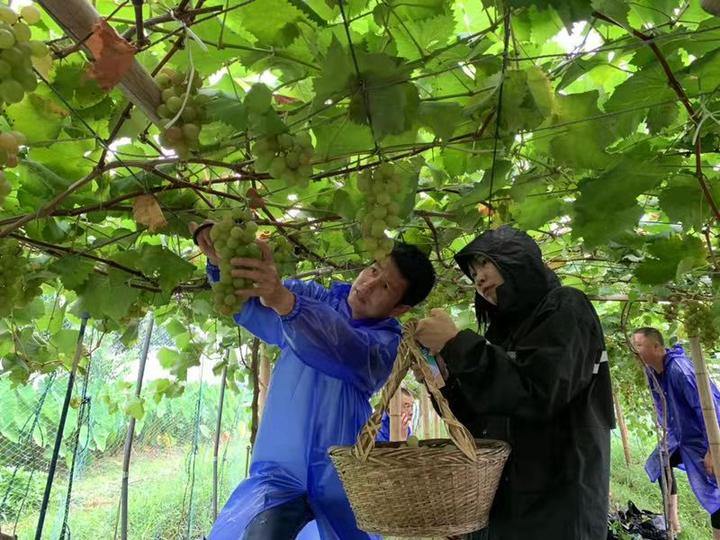 8月9日上午,台风“利奇马”来临前,路桥区横街镇组织驻村干部和村党员志愿者为农户抢收葡萄,从最大程度上降低损失。(通讯员 吴亚萍)