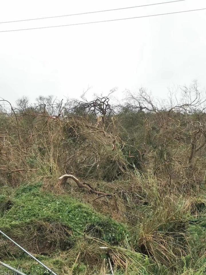 这是位于下大陈的一处景象,远处山上的原始树木犹如抽经扒皮般被吹倒、折弯,曾经树林茂密的山头变成了荒山野岭。