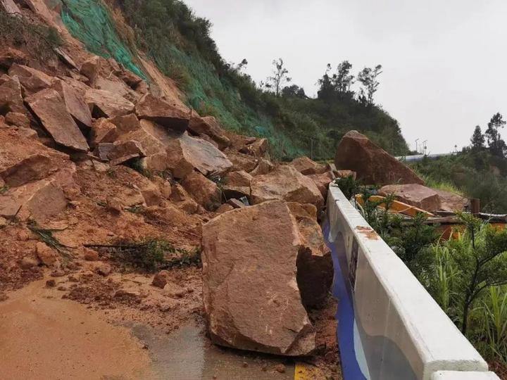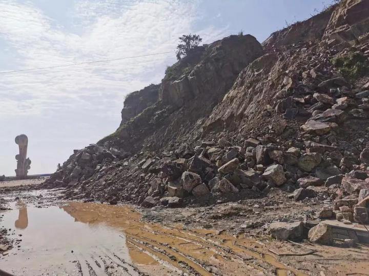 公路沿线多次塌方。其中,下大陈岛塌方体量较大的是水土路灯塔附近路段和浪通门巨浪碑附近。