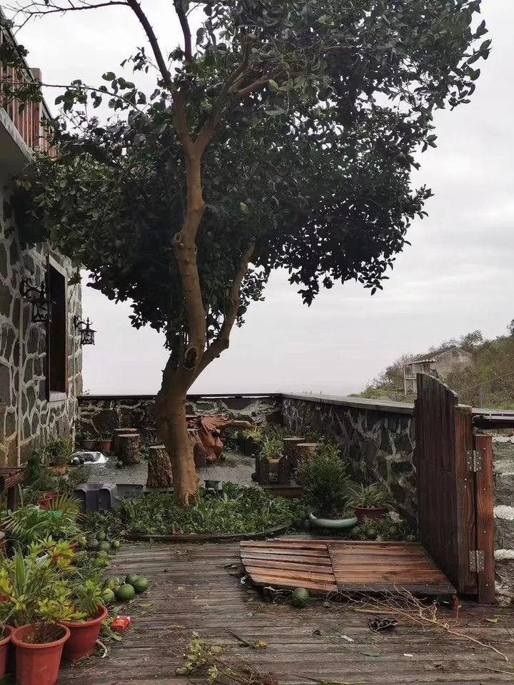 有家客栈前院的花草、栏杆都被吹得七零八落。有家老板说,游客们特别喜欢院子外面那座瞭望台,幸好他在台风来临前把瞭望台拆了,不然肯定被风吹走了,现在万幸房屋主体结构经受住了考验,门窗都没问题,只是辅助设施受损。