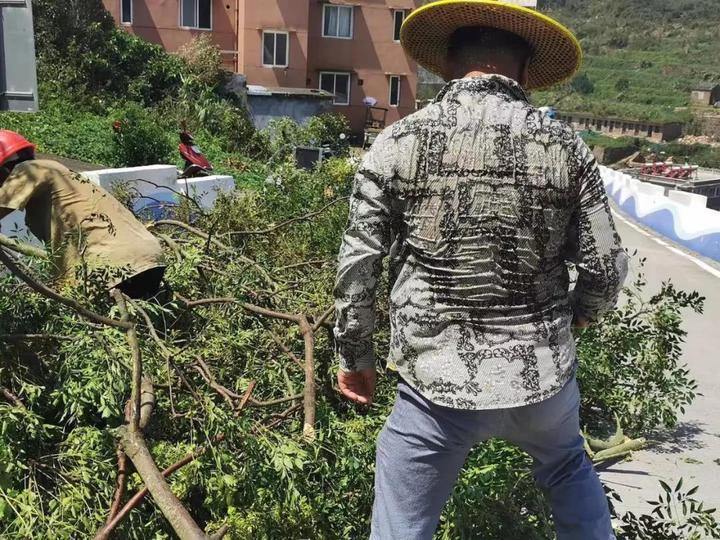 大陈镇农业综合服务中心副主任苏敏从8月10日上午5点开始持续带队开展沿路绿化、交通设施、塌方路段受灾情况统计和倒伏树木清理。从台风来临前,他就一直忙着防台和抗台工作,除了晚上休息几个小时外,已经连续工作五天,身体早已疲惫不堪。8月11日上午,台风过后,岛上阳光异常刺眼,他不顾疲累的身体拿起柴刀顶着烈日加入清理中,衣服湿了一遍又一遍。