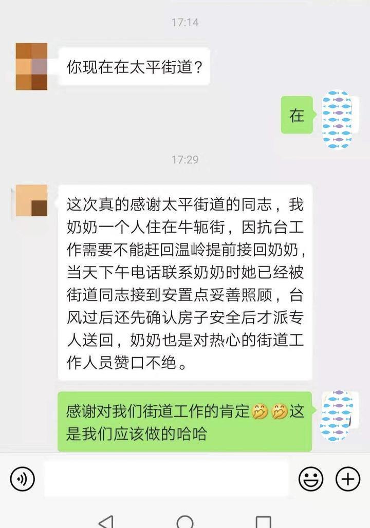 “这次真的太感谢太平街道的同志,我奶奶一个人住在牛轭街,因抗台工作需要不能赶回温岭提前接回奶奶,当天下午电话联系奶奶时,她已经被街道同志接到安置点妥善照顾,台风过后还先确认房子安全后才派专人送回,奶奶也是对热心的街道工作人员赞不绝口。”