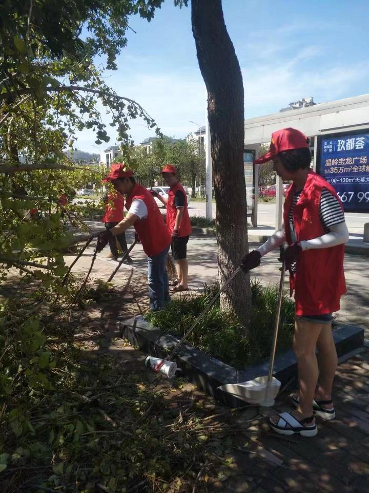 8月11日上午,温岭市人力社保局的党员志愿者们来到温岭的牛轭街、前溪路、锦屏公园、职教城周边以及城西大道沿线开展清洁家园活动。这也是温岭市人力社保局发挥机关党员干部的主心骨和先锋模范作用,积极响应市级机关党工委开展的“不忘初心作表率,灾后重建我先行”志愿服务活动。