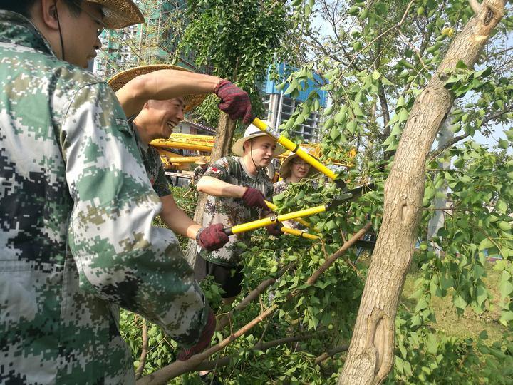 有的在修剪枝丫,有的在清理落叶碎枝,新区绿化科科长颜超琪正戴着手套用力铲土,天气闷热,他抹了一把流下来的汗珠说,“一棵树长这么大不容易,种回去还能救活。”今天7点钟,全体干部350余人就出来了,这是大家连续加班的第四天了。