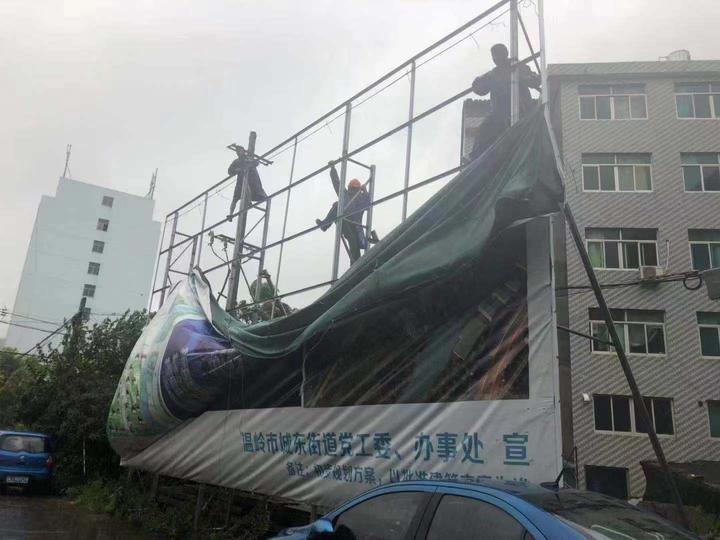 台风过后,户外广告、门头广告脱落现象严重,存在安全隐患,执法队员开展巡查,对户外广告、条幅等悬挂物进行检查,清理城市道路两侧脱落、移位的户外广告横幅等悬挂物,消除安全隐患。
