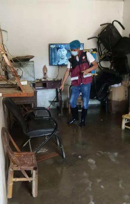 ▲三合镇及时对浸水地方开展消毒作业,保障群众生命安全。