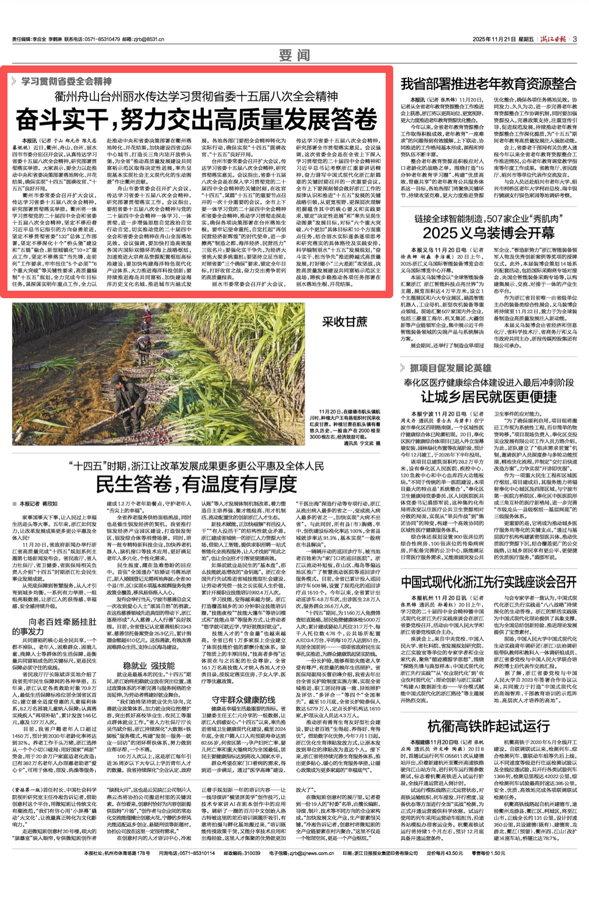 衢州市委常委会召开扩大会议,传达学习省委十五届八次全会精神,研究部署贯彻落实举措。衢州将一体学习贯彻党的二十届四中全会和省委十五届八次全会精神,坚定不移沿着习近平总书记指引的方向奋勇前进,坚定不移贯彻省委“132”总体工作部署,坚定不移深化十个“桥头堡”建设和“五链”融合、新型城镇化“10+2”重点工作,坚定不移落实“当先锋、走前列”工作要求,牢牢扭住“5个必须”“6个重大突破”等关键性要求,高质量编制“十五五”规划,全力完成今年目标任务,谋深谋实明年重点工作,全力以赴推动中央和省委决策部署在衢州落地转化、开花结果,加快建设四省边际中心城市、打造长三角内陆开放桥头堡,为全省“推动高质量发展建设共同富裕示范区取得决定性进展,率先呈现基本实现社会主义现代化的生动图景”作出衢州贡献。