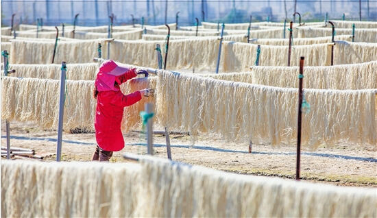 11月20日,温岭市石桥头镇的农户趁着晴好天气晾晒红薯面。红薯面是石桥头镇的特色农副产品。近年来,该镇扶持农民做大做强红薯面加工传统产业,通过“农产品+合作社+品牌”的创新模式实现产业化发展,带动农民增收,助力乡村振兴。