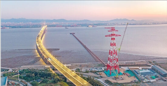 滨海-柏树500千伏线路工程椒江大跨越段正紧锣密鼓施工中。 曹琼蕾 摄