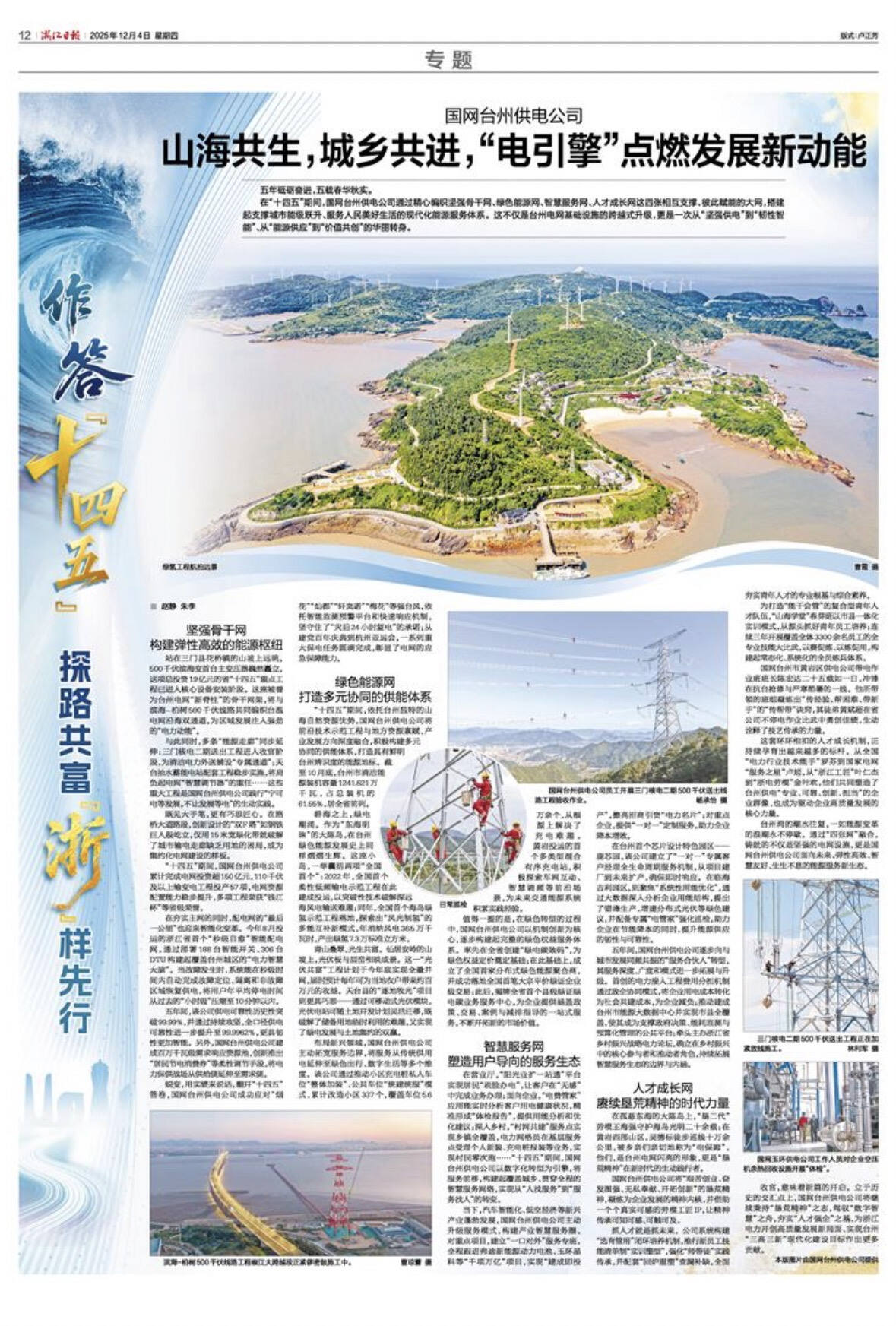 与此同时,多条“能源走廊”同步延伸:三门核电二期送出工程进入收官阶段,为清洁电力外送铺设“专属通道”;天台抽水蓄能电站配套工程稳步实施,将肩负起电网“智慧调节器”的重任……这些重大工程是国网台州供电公司践行“宁可电等发展,不让发展等电”的生动实践。