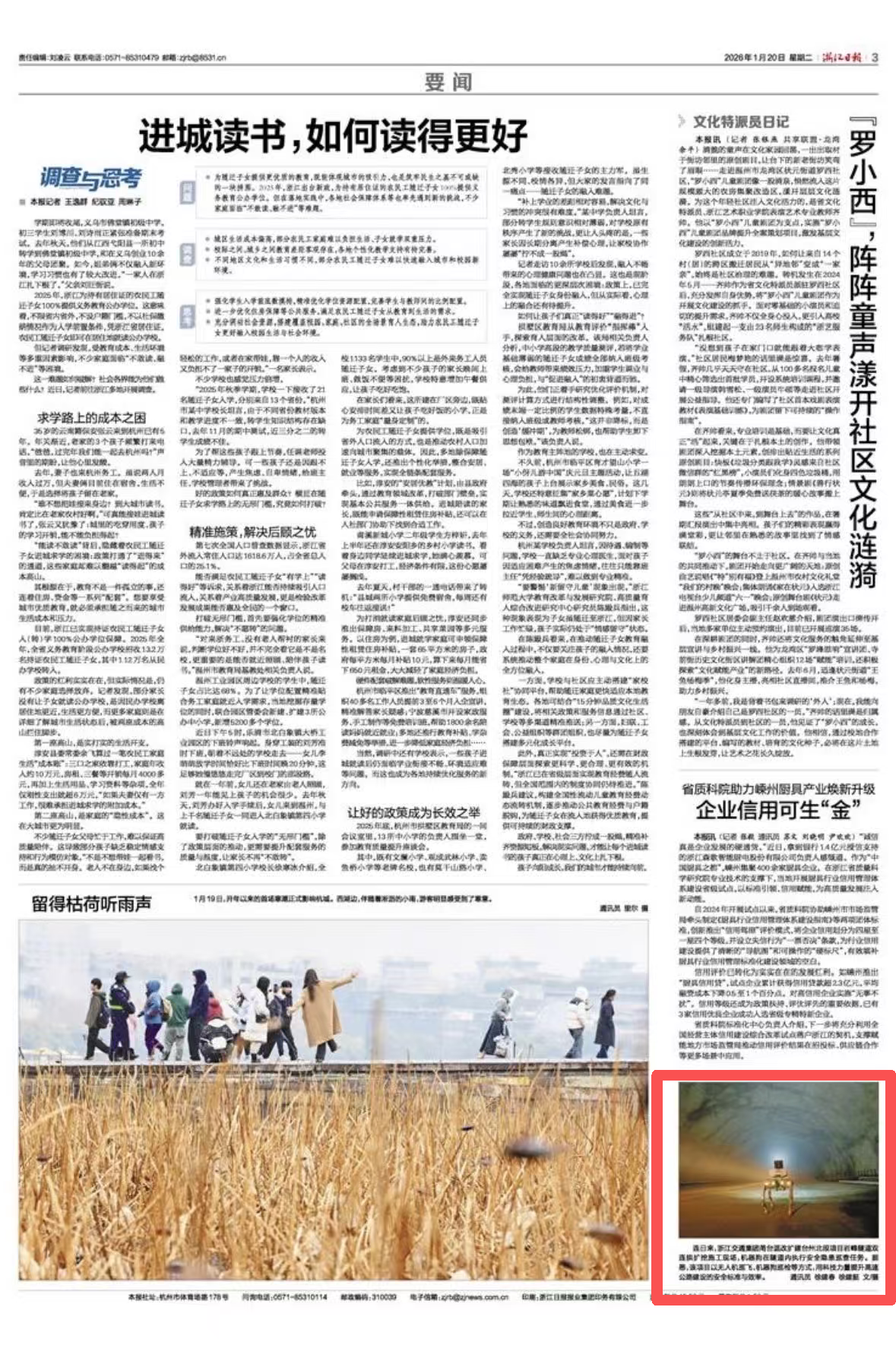 连日来,浙江交通集团甬台温改扩建台州北段项目岩峰隧道双连拱扩挖施工现场,机器狗在隧道内执行安全隐患巡查任务。据悉,该项目以无人机巡飞、机器狗巡检等方式,用科技力量提升高速公路建设的安全标准与效率。