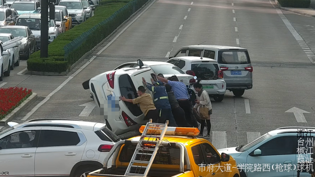 10月16日上午,台州市府大道与学院路交路口一辆白色轿车在转弯时,不慎撞上路口的交通标志杆,轿车失控侧翻,司机被困在车内无法动弹。
