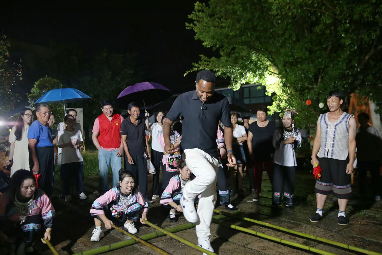 喝了酒往前走,竹竿舞的节奏声已热烈响起。六根竹竿在苗族工作人员手中随着“开合开合开开”的节奏交替叩击地面,让人忍不住跟着一起律动起来。“脚步要踩在竹竿间隙,跟着节奏来!”苗族阿妹主动上前,手把手教小帕调整步伐。起初,小帕的动作略显生疏,引得现场笑声阵阵,但经过多次体验,很快他便找到规律,动作与节奏相互配合。“这和我小时候玩‘跳房子’的游戏有点类似。”小帕擦着额头的汗,笑容灿烂,“感觉像是回到了童年和朋友们一起玩耍,真是太有意思了!”