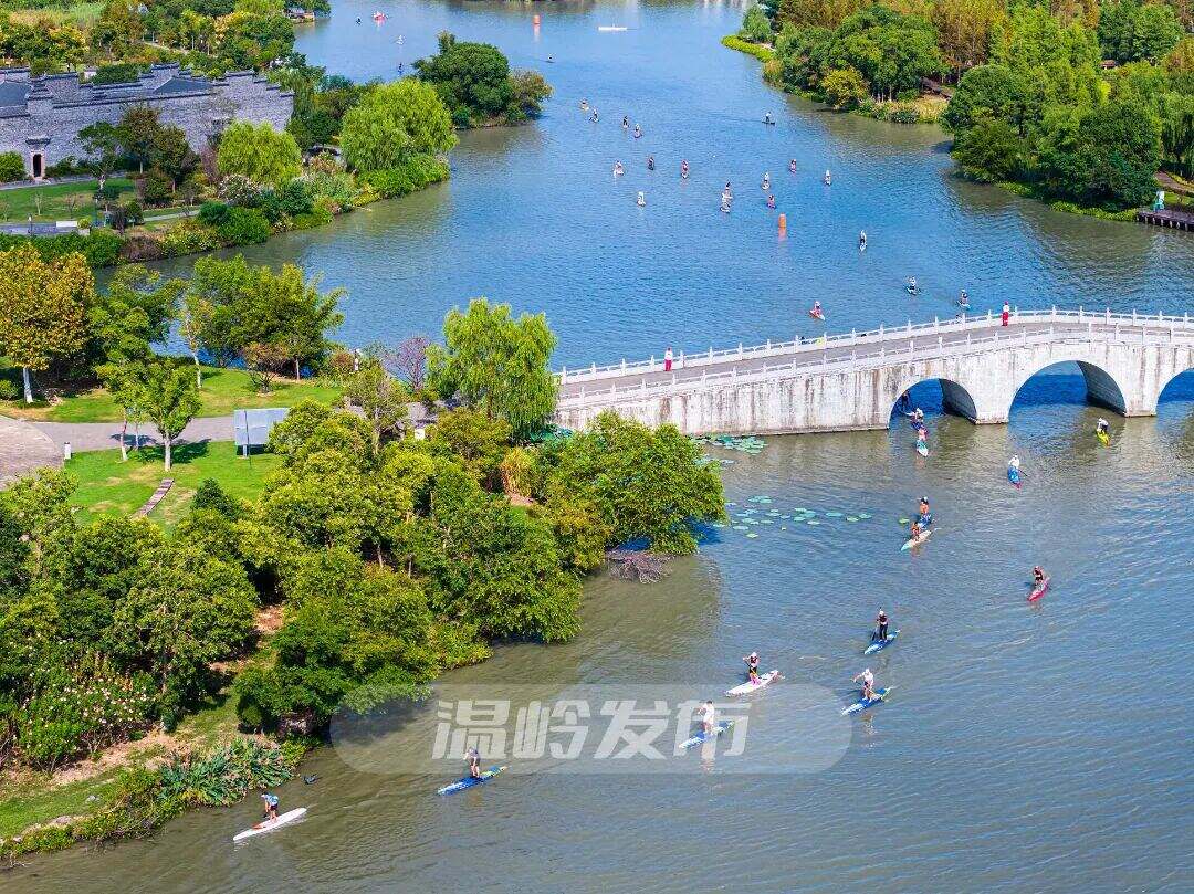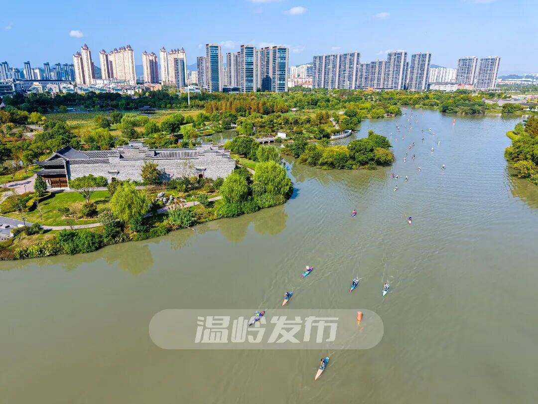 10月11日,浙江省第五届体育大会桨板比赛在温岭市九龙汇公园开赛。在这片横跨城市中心的生态绿廊里,来自全省10支队伍的近200名选手逐浪挥桨,尽情享受比赛。