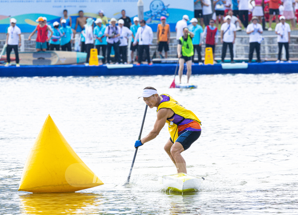 上午9时许,随着哨声响起,2000米绕标赛率先开赛,一叶叶色彩斑斓的桨板划破湖面,勾勒出一条绚丽的彩带。