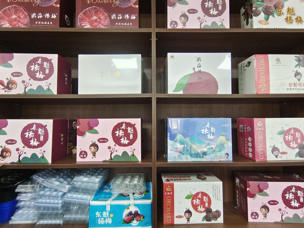 走进临海市小玩子水果合作社,一整面展示墙格外吸睛:从最初的杨梅实拍图,到神情灵动的卡通形象“梅妹”,一排排包装盒按年份陈列,勾勒出合作社的发展轨迹。