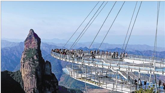 1月2日,游客在仙居县神仙居景区南天顶玻璃观景台上游玩。