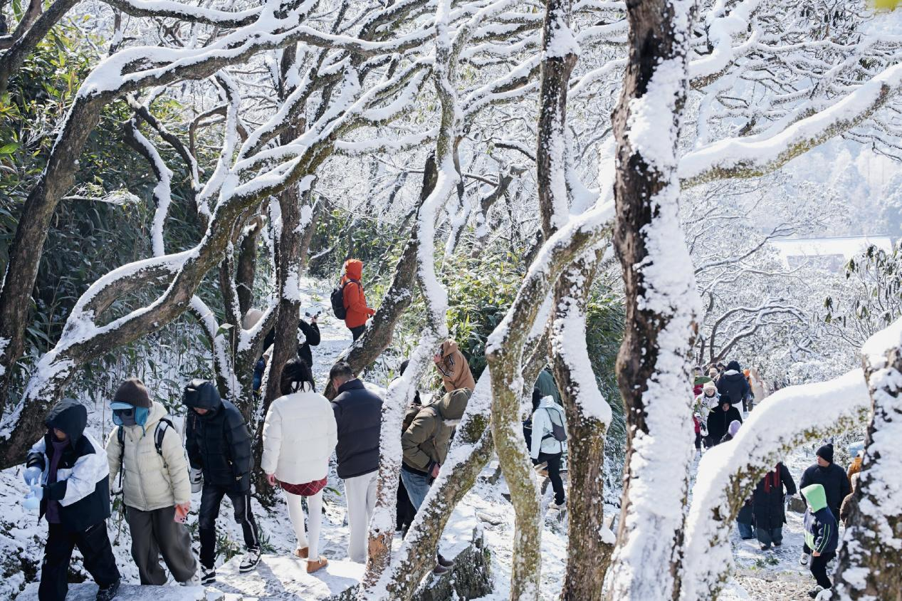 华顶景区杜鹃林里,游客在雪中赏景游玩,感受浪漫天台山。