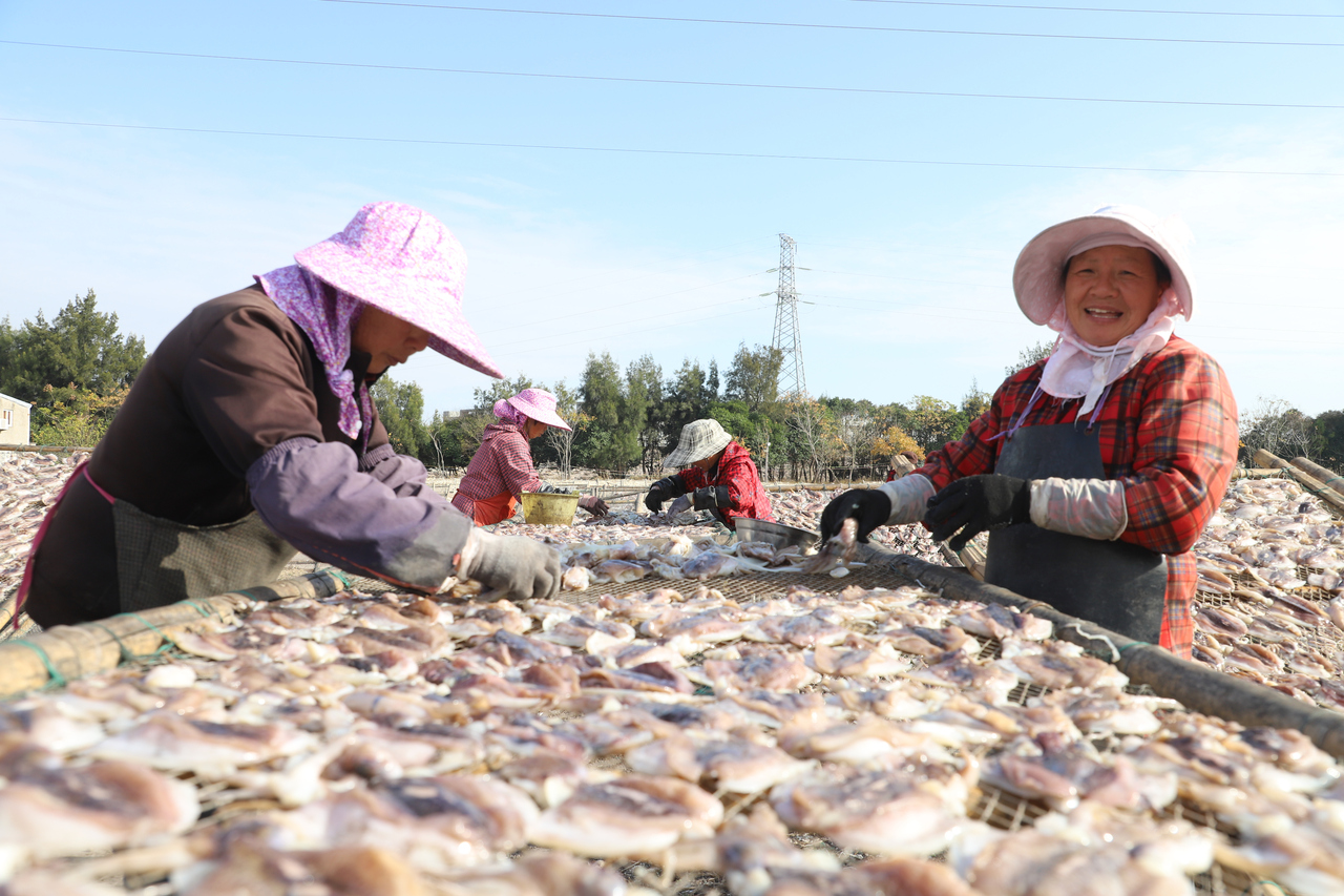 图为松门当地的水产加工户在晒鲞。
