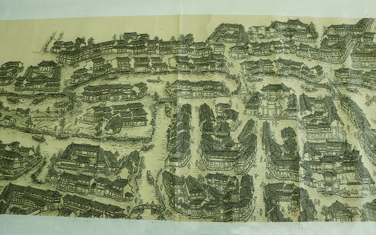 今年元旦,林伯聪的画稿终于完成。其内,木城河、运粮河清晰可见,原有因二河而成的箬横老街三个岛区也分门而立,几大家族聚居,百行百业分列,宛若近百年前的旧景穿越归来。