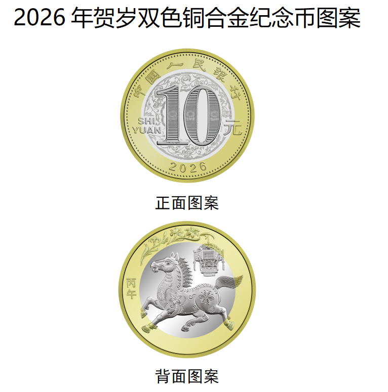双色铜合金纪念币面额10元,直径27毫米,材质为双色铜合金。正面图案为“中国人民银行”“10元”字样,汉语拼音字母“SHIYUAN”及年号“2026”,底纹衬以团花图案。背面图案为中国传统剪纸艺术与装饰年画元素相结合的马形象,衬以花灯和萱草图案,币面左侧刊“丙午”字样。