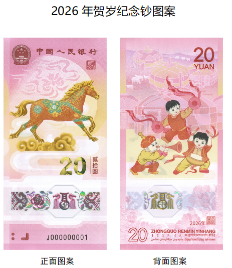 纪念钞面额20元,票面长145毫米,宽70毫米,采用塑料材质。正面主景为马的造型图案,上方为中华人民共和国国徽、“中国人民银行”、篆书“马”字印章,下方依次为光彩光变面额数字“20”与汉字“贰拾圆”、动感全息图案、透明视窗、盲文面额标记和冠字号码。背面主景为儿童欢庆锣鼓图案,辅以蒙古包装饰图案,上方为面额数字“20”、汉语拼音字母“YUAN”,下方为花卉与动感全息图案、年号“2026年”、行长章、面额数字“20”“中国人民银行”汉语拼音和蒙、藏、维、壮四种民族文字的“中国人民银行贰拾圆”字样。