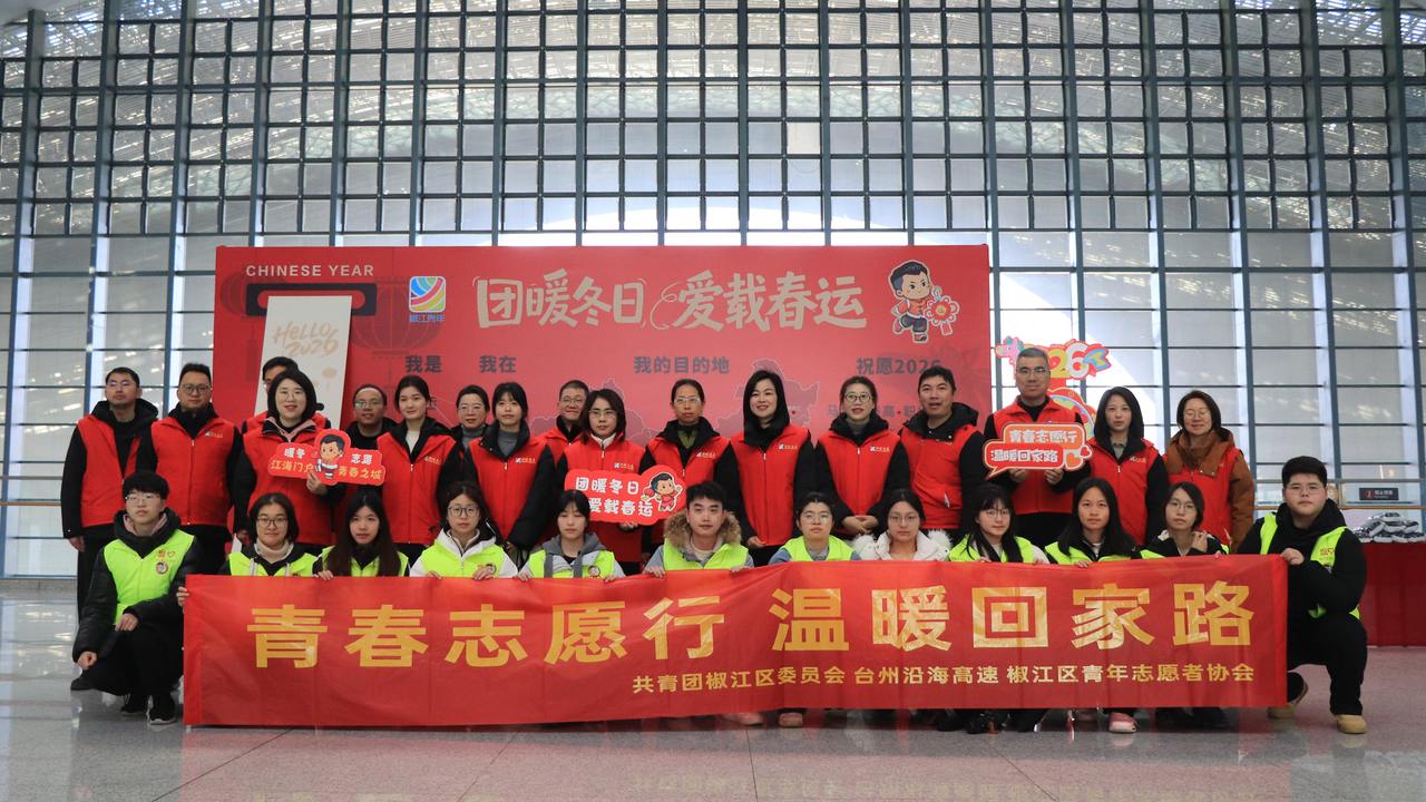 为切实向春运旅客出行提供便利服务,当天上午,椒江团区委、浙江台州市沿海高速公路有限公司、椒江区青年志愿者协会等部门联合开展2026年台州青年志愿者服务春运“青春志愿行·温暖回家路”活动,一面喜庆的马年主题背景墙设立在了高铁台州站二楼候车厅内,墙面设有多个互动节点。