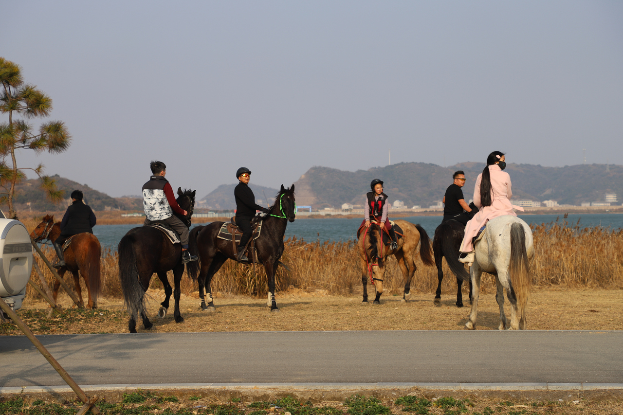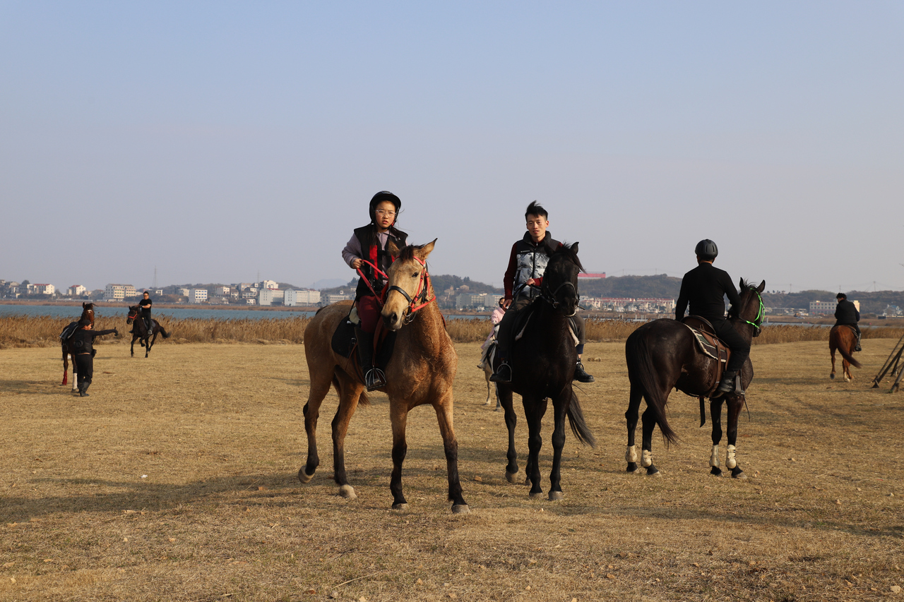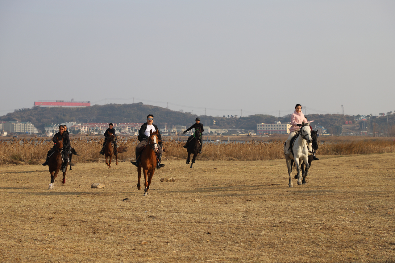图为骑马爱好者在龙门湖策马扬鞭,享受运动乐趣。