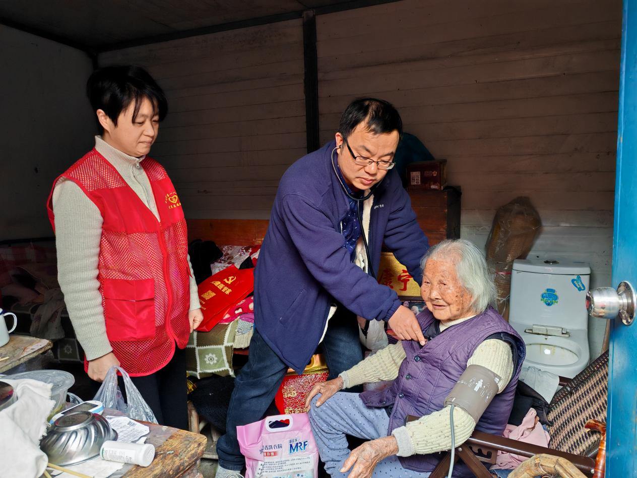 慰问现场暖意融融,慰问组精准对接各类帮扶对象,开展全方位关爱服务。他们上门走访百岁老人与困难群众,关切询问身体状况与生活难题,送上慰问物资与诚挚祝福,鼓励困难群众树立信心、积极生活,叮嘱家属悉心照料老人,守护好晚年幸福。针对留守儿童,慰问组送上书包、学习用品等爱心物资,与孩子们亲切交流,勉励他们刻苦学习、自立自强,在关爱中向阳成长。与此同时,市一院急诊党支部医护人员搭建“移动健康驿站”,为百岁老人及现场群众开展简易体检,通俗讲解日常保健与应急急救知识,耐心回应大家关于疾病预防、用药安全等方面的疑问,让优质医疗服务真正精准触达群众“家门口”。