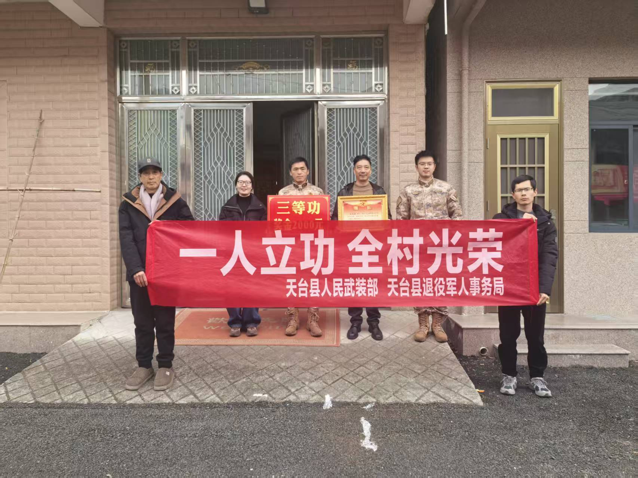 为弘扬拥军优属传统,彰显对军人职业的尊崇,近日,天台县退役军人事务局副局长孙玲玲带队,由县人武部、县退役军人事务局、街头镇武装部、合溪姚村退役军人服务站工作人员等组成慰问小组,专程前往荣立三等功的现役军人姚天威家中,为其家属送上喜报与奖励金,传递党和政府的深切关怀。