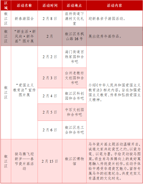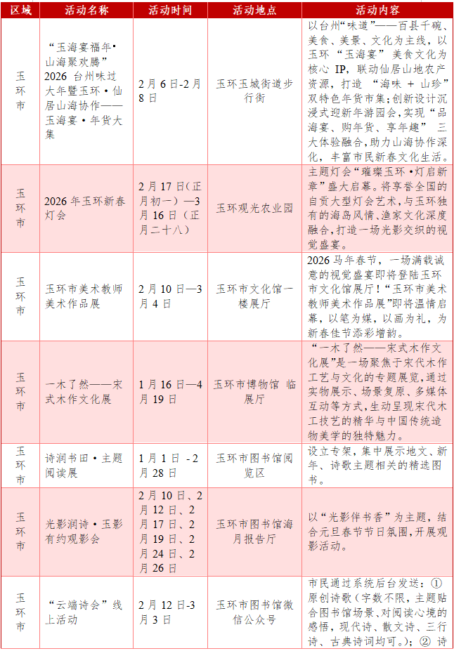 活动内容:以台州“味道”——百县千碗、美食、美景、文化为主线,以玉环 “玉海宴” 美食文化为核心 IP,联动仙居山地农产资源,打造 “海味 + 山珍” 双特色年货市集;创新设计沉浸式迎新年游园会,实现 “品海宴、购年货、享年趣” 三大体验融合,助力山海协作深化,丰富市民新春文化生活。