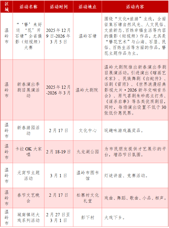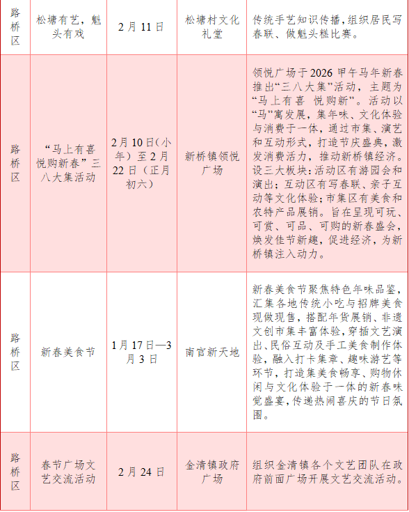 活动内容:春季期间,路桥围绕禧品年俗、禧看大戏、禧尝美食、禧逛大集、禧观村晚、禧觅大展、禧乐潮玩、禧享赛事八大主题整合文旅资源,打造多样活动场景,让市民游客沉浸体验路桥新春文化,感受年味。