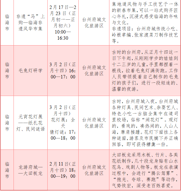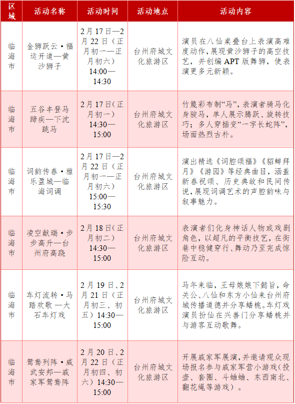 活动内容:黄沙狮子、下沈跳马、临海词调、台州府高跷、大石车灯戏、戚家军鸳鸯阵、临海非遗风华市集……多样化的活动,为市民提供了新春游玩好去处。