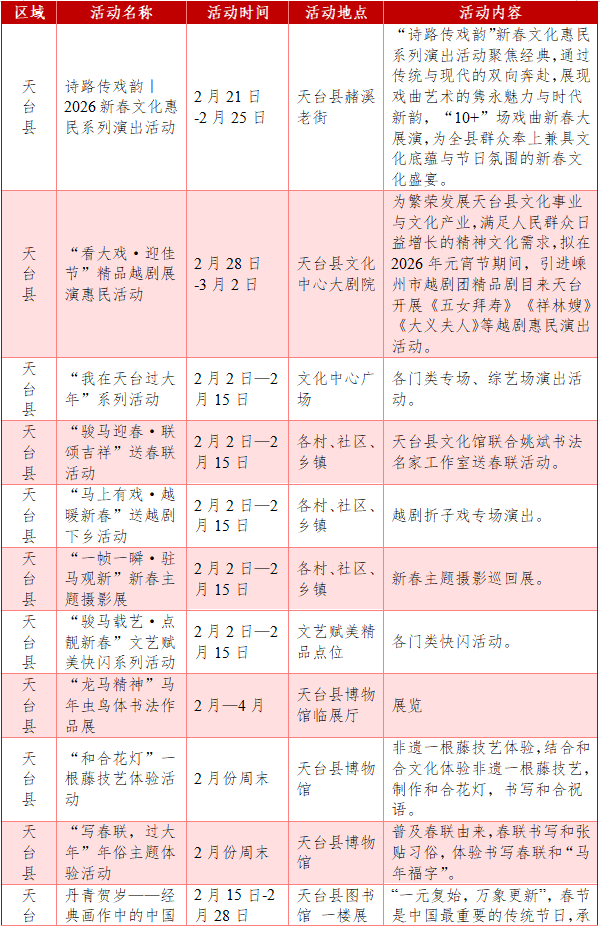 活动内容:为繁荣发展天台县文化事业与文化产业,满足人民群众日益增长的精神文化需求,拟在2026年元宵节期间,引进嵊州市越剧团精品剧目来天台开展《五女拜寿》《祥林嫂》《大义夫人》等精品越剧惠民演出活动。